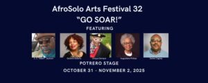AfroSolo Theatre Company presents the 32nd Annual AfroSolo Arts Festival, with the theme GO SOAR! The theme is an admonition to strive beyond one’s expectations. The Festival takes place Friday, October 31, 2025, at 7:00 pm, Saturday, November 1, 2025, at 7:00 pm, and Sunday, November 2, 2025, at 3:00 pm at the Potrero Stage, 1695 18th Street in San Francisco. 415-771-2376.